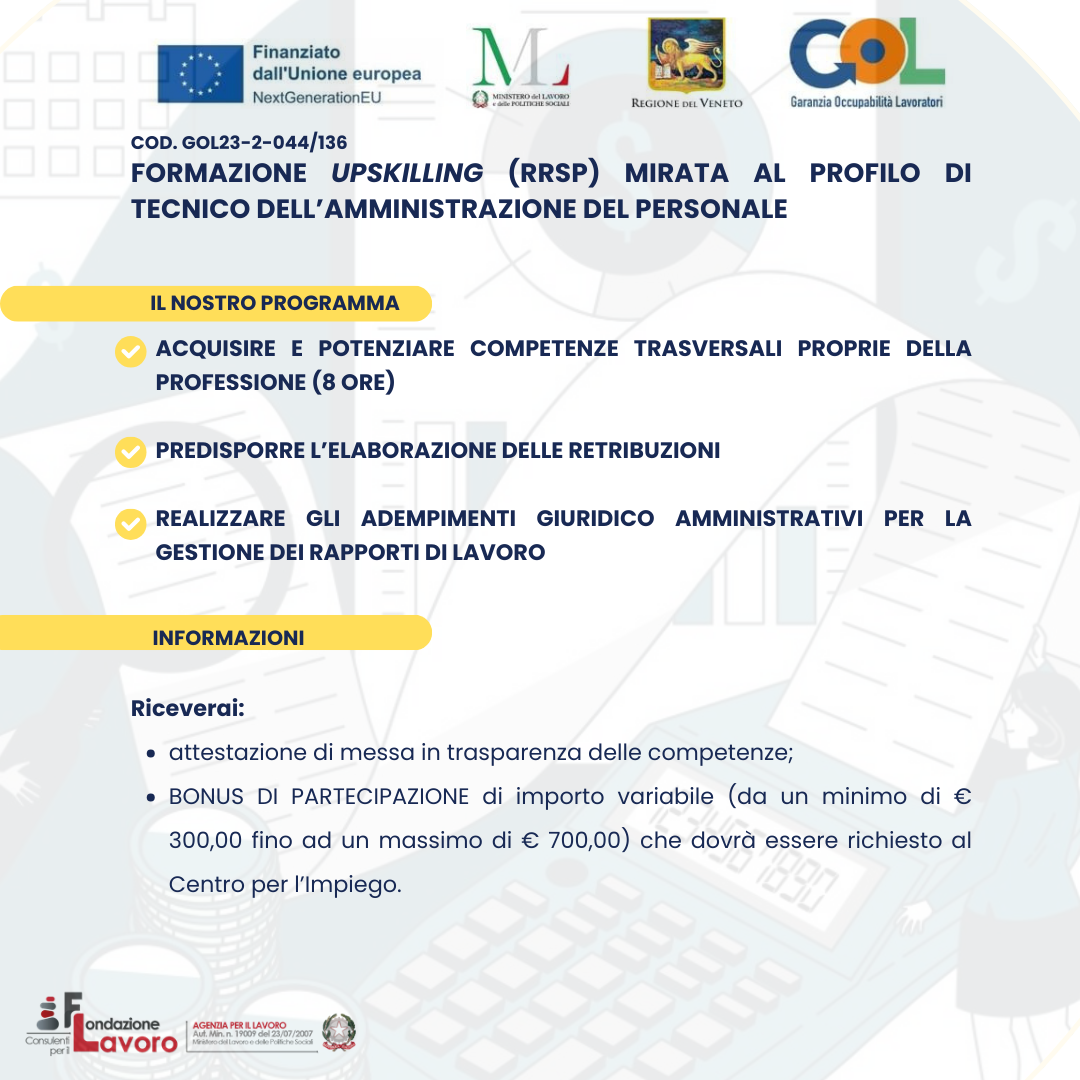 COD. GOL23-2-044/136 – UPSKILLING (RRSP) MIRATA AL PROFILO DI TECNICO DELL’AMMINISTRAZIONE DEL PERSONALE