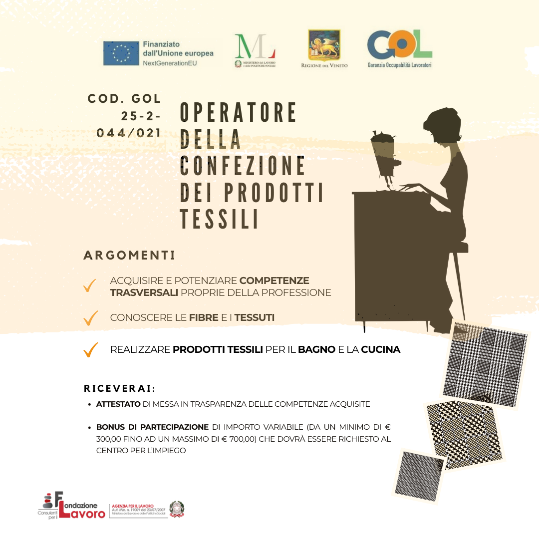 COD. GOL25-2-044/021 – UPSKILLING (RRSPP) MIRATA AL PROFILO DI OPERATORE DELLA CONFEZIONE DI PRODOTTI TESSILI